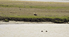Windy weather is a double problem. You don't feel like standing there getting windblown, trying to hold the scope steady, while you scan for birds that in any case, are much smarter than you and have decided to hunker down in the grass out of the wind. So the first trip around the dikes was kind of dispiriting. After lunch, the sun started to come through the overcast and it warmed up a few degrees so we did another loop, adding a few birds to the list. The most interesting was this Bald Eagle which sent a group of cormorants off their roost and panicked a flock of shorebirds. The black ducks didn't seem to mind its presence.